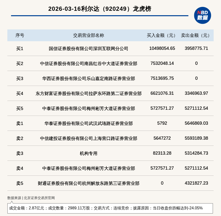 每經(jīng)訊,2026年3月16日,北交所上市公司利爾達(dá)(920249,收盤價(jià):9.44元)登上龍虎榜,交易方式是連續(xù)競價(jià),披露原因是當(dāng)日收盤價(jià)跌幅達(dá)到-24.05%,成交數(shù)量2989.11萬股,成交金額2.87億元。買一席位為國信證券股份有限公司深圳互聯(lián)網(wǎng)分公司,買入1049.81萬元;賣一席位為華泰證券股份有限公司武漢武珞路證券營業(yè)部,賣出564.69萬元。