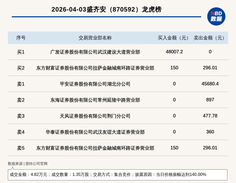 每經(jīng)訊,2026年4月3日,新三板基礎(chǔ)層公司盛齊安(870592,收盤價(jià):3.6元)登上龍虎榜,交易方式是集合競(jìng)價(jià),披露原因是當(dāng)日價(jià)格振幅達(dá)到140.00%,成交數(shù)量1.35萬(wàn)股,成交金額4.82萬(wàn)元。買一席位為廣發(fā)證券股份有限公司武漢建設(shè)大道營(yíng)業(yè)部,買入4.8萬(wàn)元;賣一席位為平安證券股份有限公司湖北分公司,賣出4.57萬(wàn)元。