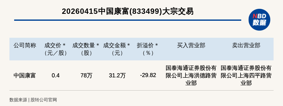 每經(jīng)訊,2026年4月15日,新三板基礎(chǔ)層公司中國(guó)康富(833499,收盤(pán)價(jià):0.57元)發(fā)生一筆大宗交易,成交價(jià)0.4元/股,成交數(shù)量78萬(wàn)股,成交金額31.2萬(wàn)元,折價(jià)29.82%。買(mǎi)入營(yíng)業(yè)部是國(guó)泰海通證券股份有限公司上海洪德路營(yíng)業(yè)部,賣(mài)出營(yíng)業(yè)部是國(guó)泰海通證券股份有限公司上海四平路營(yíng)業(yè)部。
