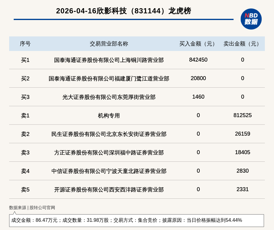 每經(jīng)訊,2026年4月16日,新三板創(chuàng)新層公司欣影科技(831144,收盤價:4元)登上龍虎榜,交易方式是集合競價,披露原因是當日價格振幅達到54.44%,成交數(shù)量31.98萬股,成交金額86.47萬元。買一席位為國泰海通證券股份有限公司上海銅川路營業(yè)部,買入84.24萬元;賣一席位為機構(gòu)專用,賣出81.25萬元。