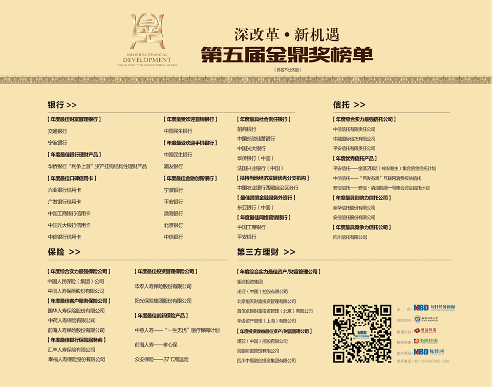 金鼎獎(jiǎng)?傳統(tǒng)金融評(píng)選活動(dòng)是專門針對(duì)銀行、保險(xiǎn)、信托領(lǐng)域而設(shè)定,其評(píng)選過(guò)程嚴(yán)謹(jǐn)、科學(xué),通過(guò)多個(gè)維度考量該領(lǐng)域機(jī)構(gòu)在一年內(nèi)的各方面表現(xiàn).