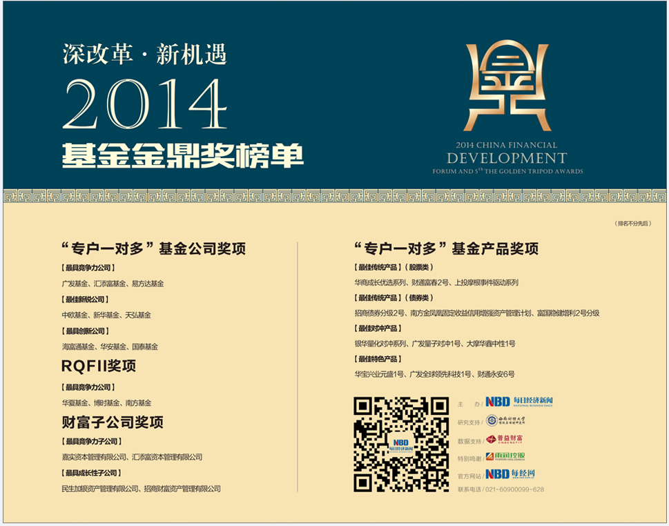 “金鼎獎(jiǎng)” 作為《每日經(jīng)濟(jì)新聞》全力打造的核心品牌活動(dòng)之一,已經(jīng)成功舉辦四屆,其憑借專業(yè)、權(quán)威的評(píng)選標(biāo)準(zhǔn)得到了社會(huì)各界的廣泛 關(guān)注與認(rèn)可,成為冬季中國(guó)金融行業(yè)最受矚目的大事記。今年,《每日經(jīng)濟(jì)新聞》繼續(xù)聯(lián)合權(quán)威學(xué)術(shù)單位,運(yùn)用科學(xué)的模型和研究方法,為 中國(guó)高端投資者提供一份公正、權(quán)威的金融產(chǎn)品、品牌和團(tuán)隊(duì)機(jī)構(gòu)的榜單。